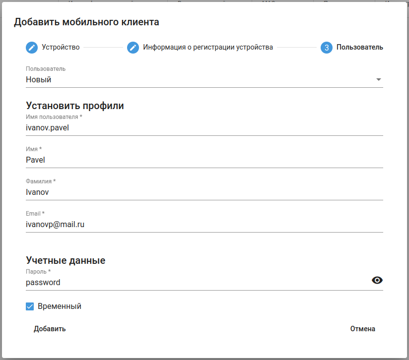 5. Заполните поля в диалоговом окне в третьем пункте «Пользователь»: «Пользователь» — Новый, «Имя пользователя» — Логин для авторизации, «Имя» — Имя пользователя, «Фамилия» — Фамилия пользователя, «Email» — Электронная почта, «Пароль» — Пароль для авторизации, выберите временный, чтобы пользователь сразу сменил его при первом входе (Рисунок 4).