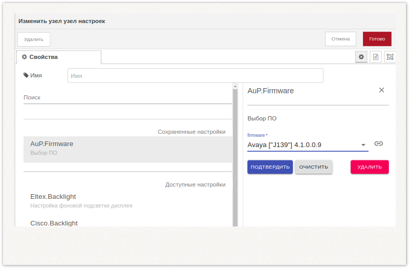 • Далее нам необходимо в "Графе конфигурационных параметров" в блоке "узел настроек" необходимо выбрать параметр AuP.Firmware