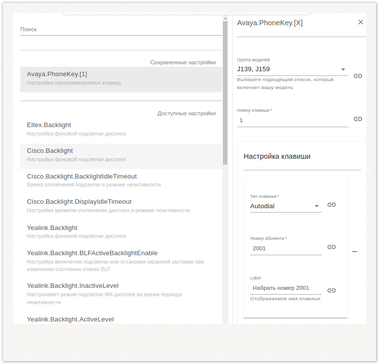 В "Графе конфигурационных параметров" в блоке "узел настроек" необходимо выбрать и настроить параметр Avaya.PhoneKey.[X]: