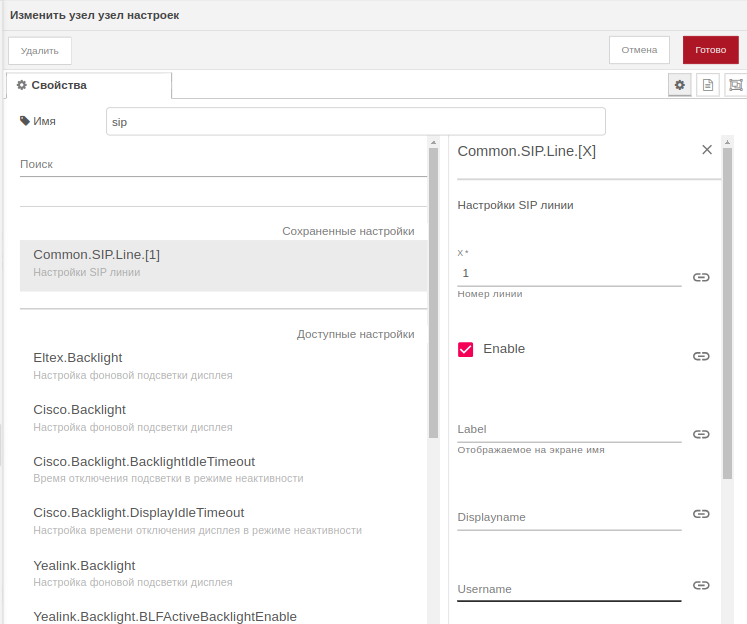 • В блоке "узел настроек" выбрать параметр Common.SIP.Line.[X]