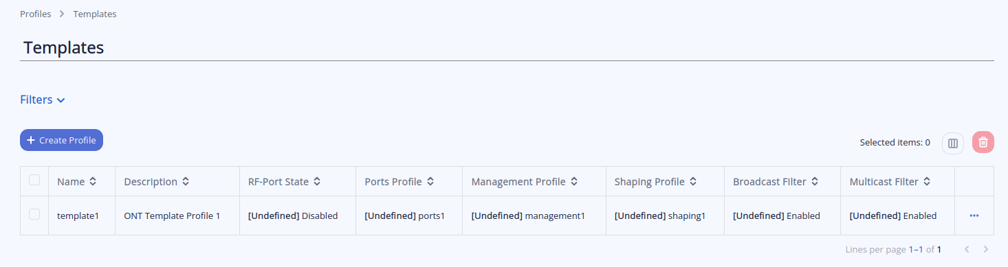 2. При первичной настройке в данном разделе будет присутствовать template, созданный по умолчанию. Данный template будет включать все созданные по умолчанию на OLT сервисные профили.
