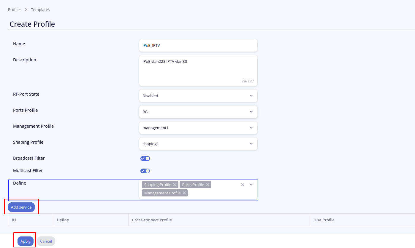 • Для добавления сервисных профилей (cross-connect и dba) нужно выбрать Add service. После завершения настройки template нужно выполнить Apply  (Выделено красным).