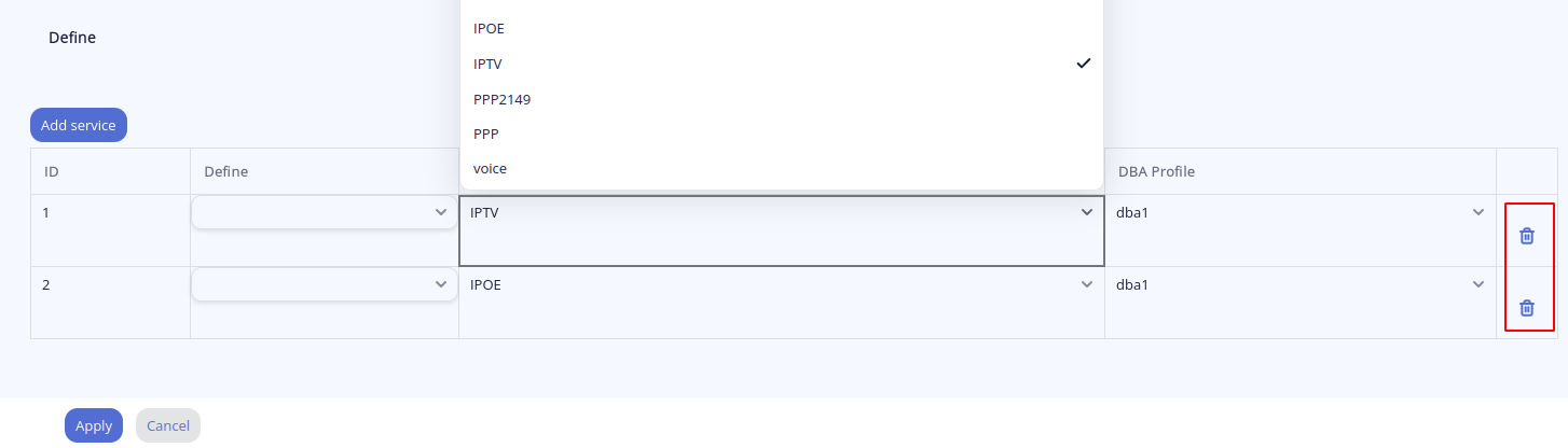 4. После нажатия "Add service" появится блок управления сервисами, где будет доступно указание сервисных профилей cross-connect и dba для услуг. Предположим, что на OLT ранее были созданы профили cross-connect для услуг "IPTV" и "IPoE" с соответствующими именами. Назначим профиль "IPTV" на сервис 1, "IPOE" – на сервис 2.