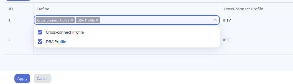 • Поле Define указывает, какие профили будут определяться данным template. Если профиль не указан в данном списке, при назначении данного template на ONT, будет применяться профиль, назначенный непосредственно на interface ont (Выделено синим).