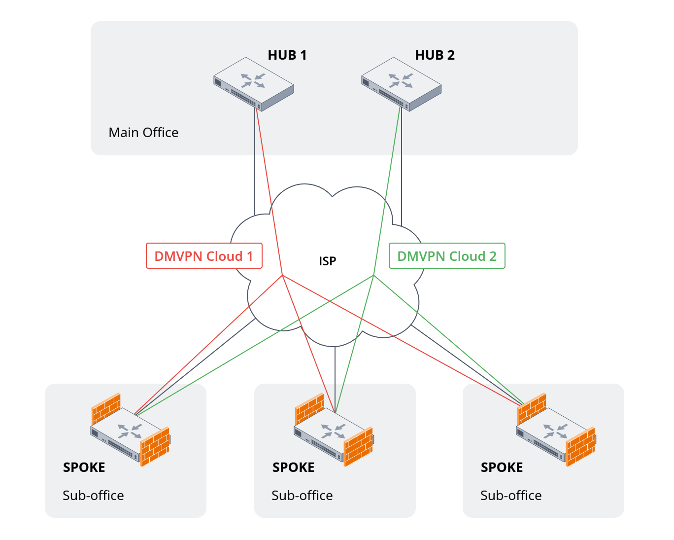 Figure 1. General diagram of DMVPN cloud deployment for providing a secure communication link between offices