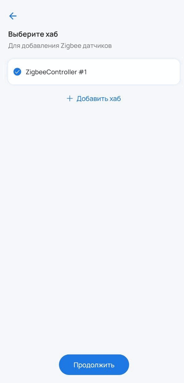 2. Из списка выберите хаб и нажмите Продолжить. Если необходимый хаб не добавлен, нажмите Добавить хаб и следуйте инструкции.