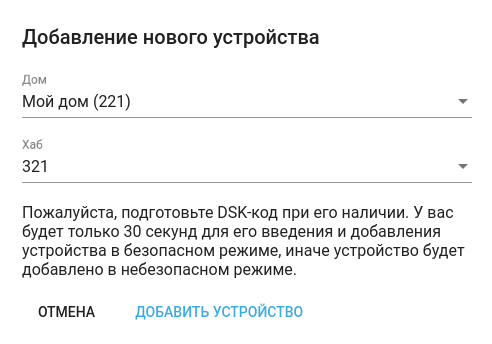 Если неверно ввести код DSK, то платформа всё равно добавит устройство, но в небезопасном режиме, а также выдаст сообщение о том, что введен неверный код. Для исправления этой ситуации нужно удалить устройство и добавить его снова, используя корректный DSK-ключ.
