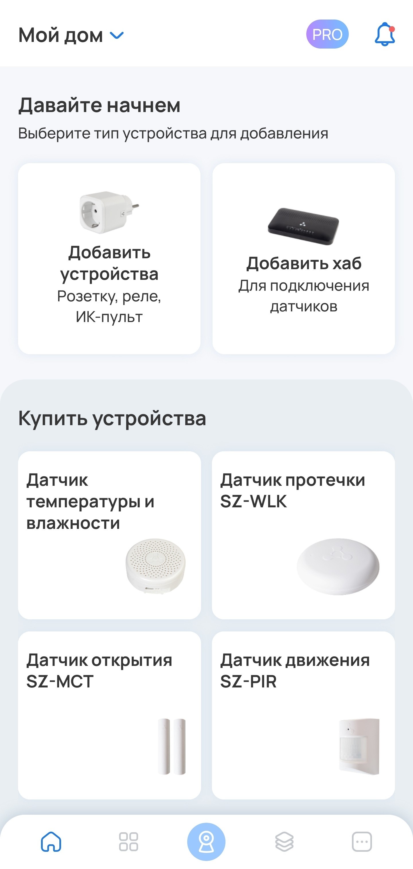 Для добавления новых устройств необходимо добавить хаб: