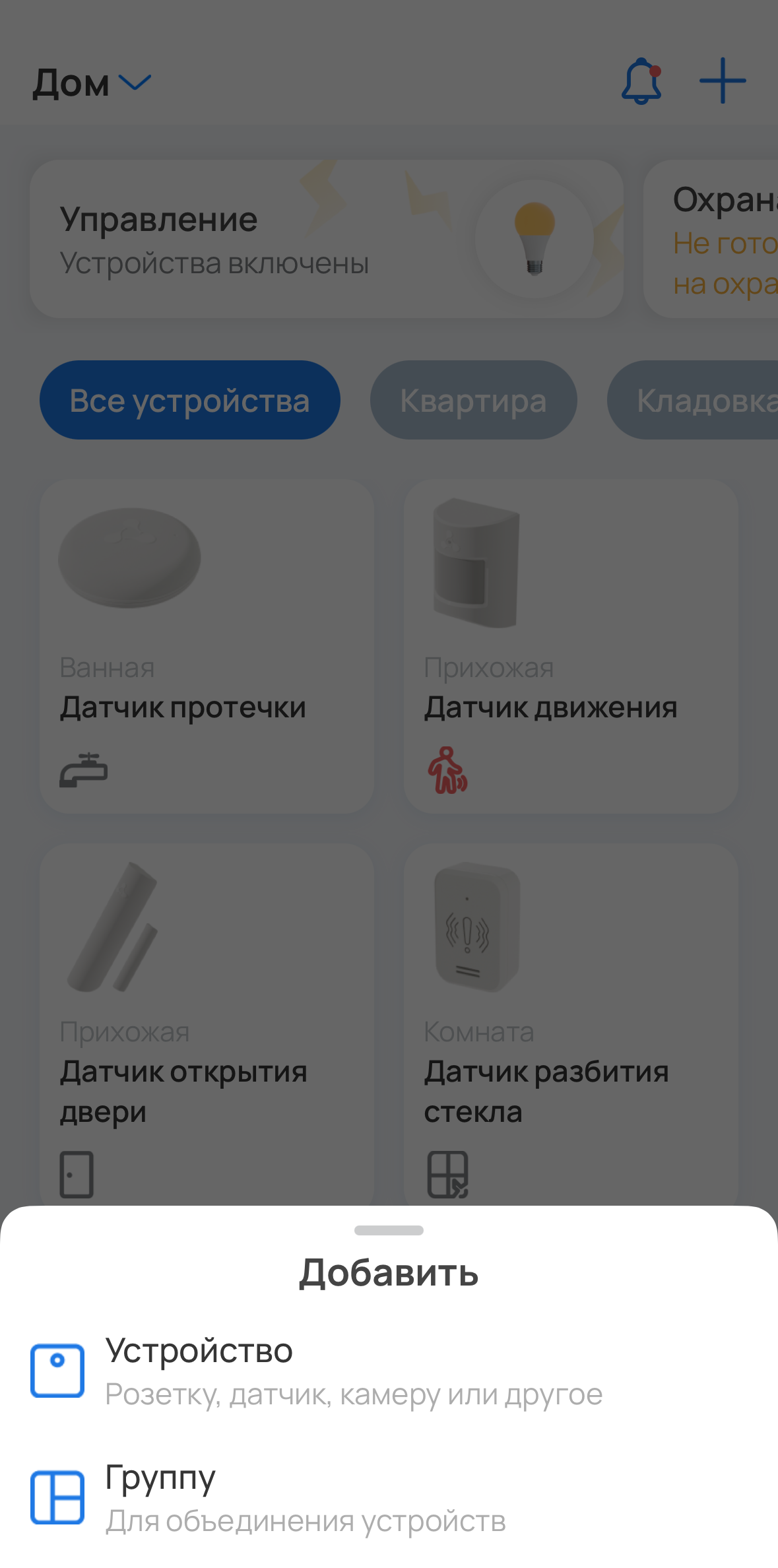 Если в доме есть устройства, нажмите на иконку в правом верхнем углу экрана и во всплывающем окне выберите пункт Устройство.
