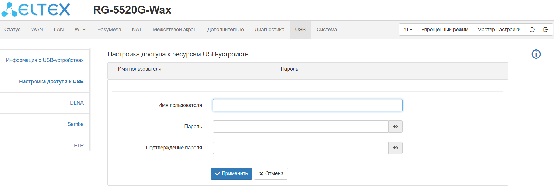 В этом подменю выполняется создание пользователя для доступа к ресурсам на USB.
