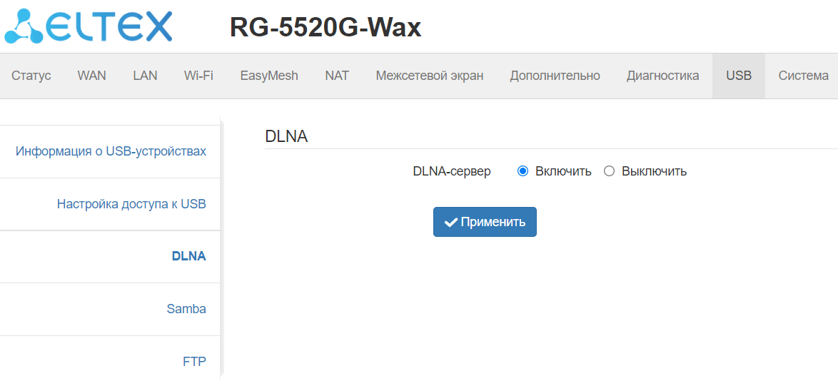 В данном подменю можно включить функционал DLNA-сервера.