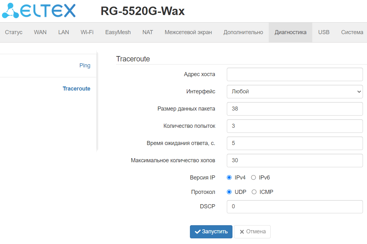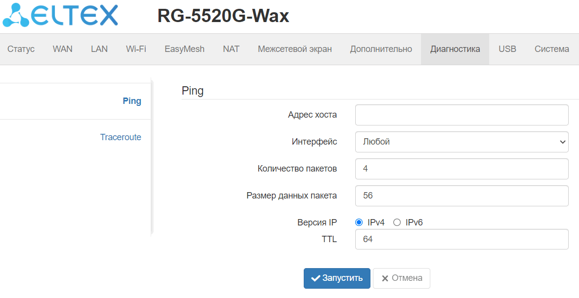 Данное подменю позволяет запустить ping с любого интерфейса устройства до любого хоста при помощи web-интерфейса.
