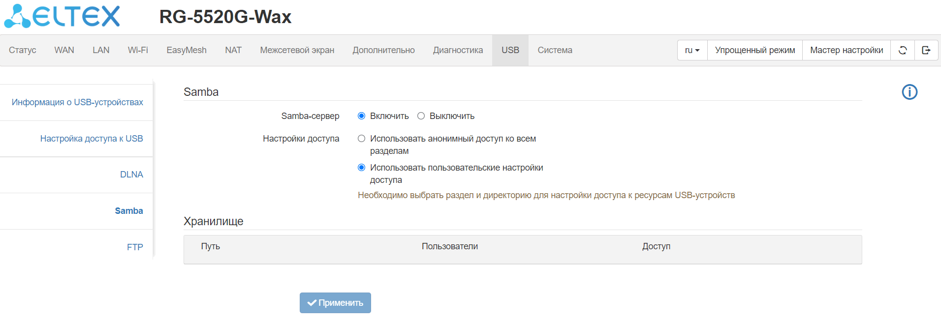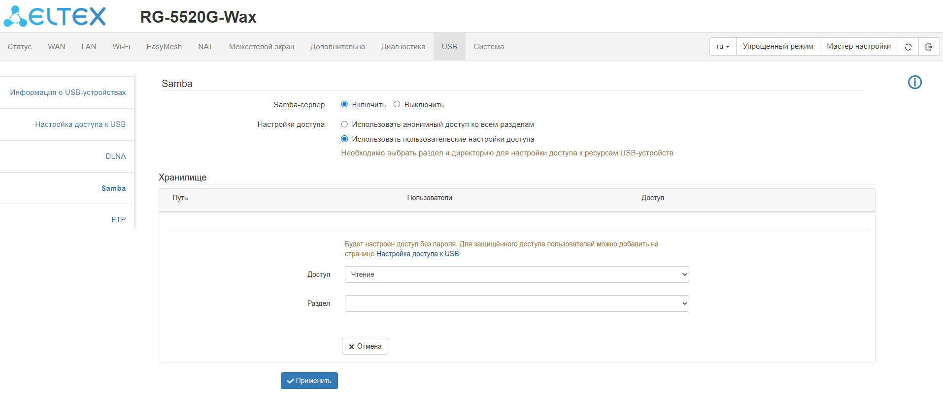 При включении Samba-сервера становится доступной возможность настройки анонимного доступа.