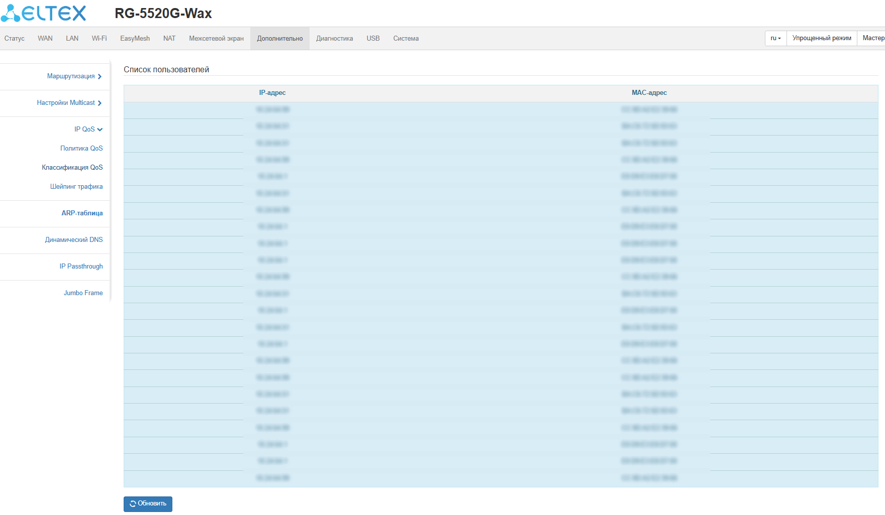 Подменю «ARP Таблица»