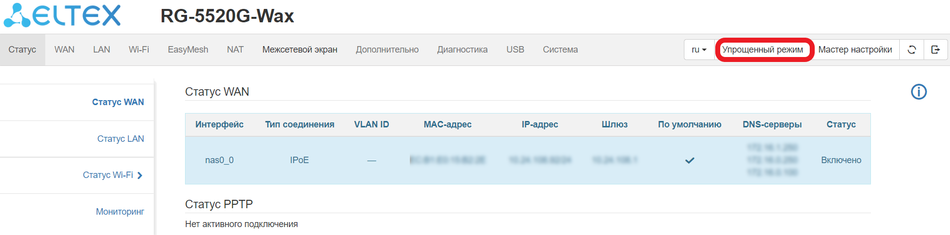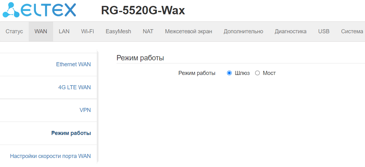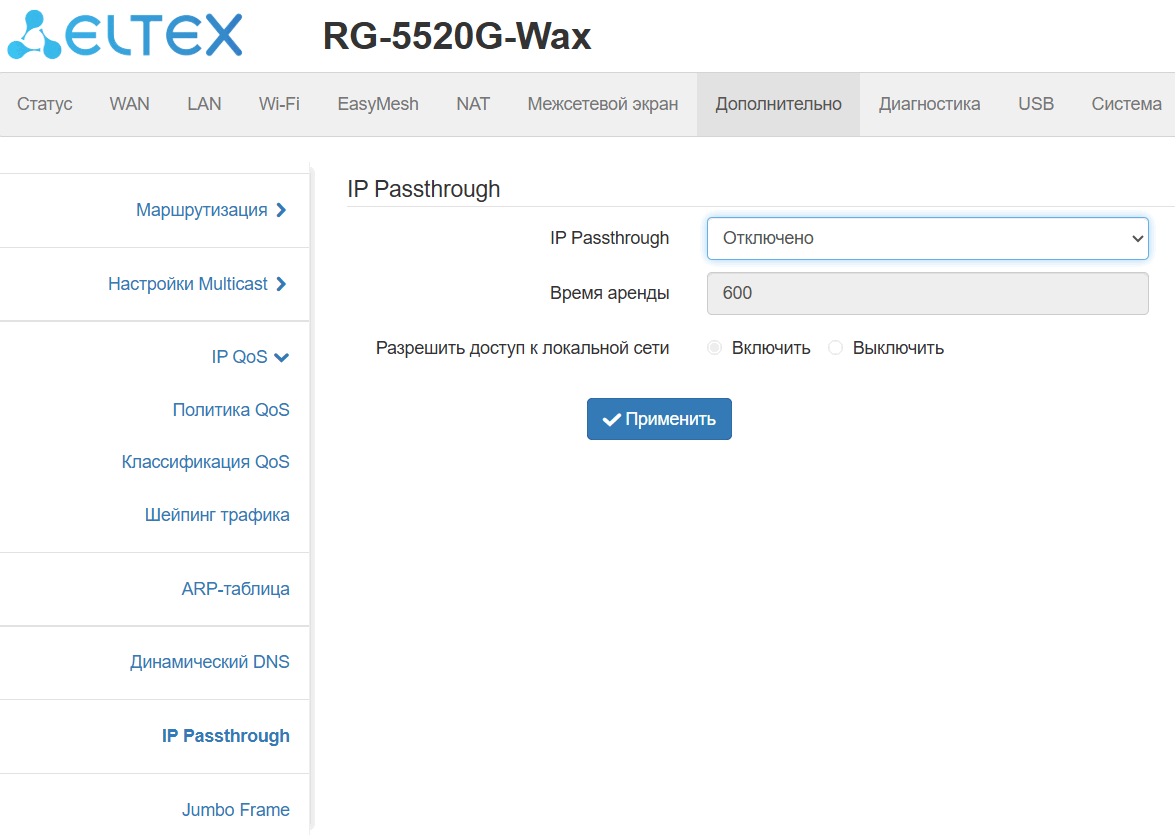 Режим «IP Passthrough» позволяет прозрачно транслировать внешний IP-адрес с PPPoE-интерфейса на внутреннего локального клиента.