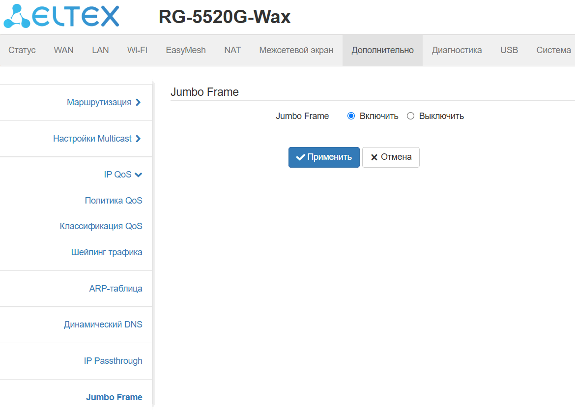 Данное подменю используется для настройки интерфейсов устройств, которые работают с кадрами Ethernet, превышающими стандартные 1500 байт.