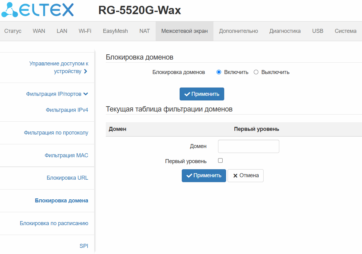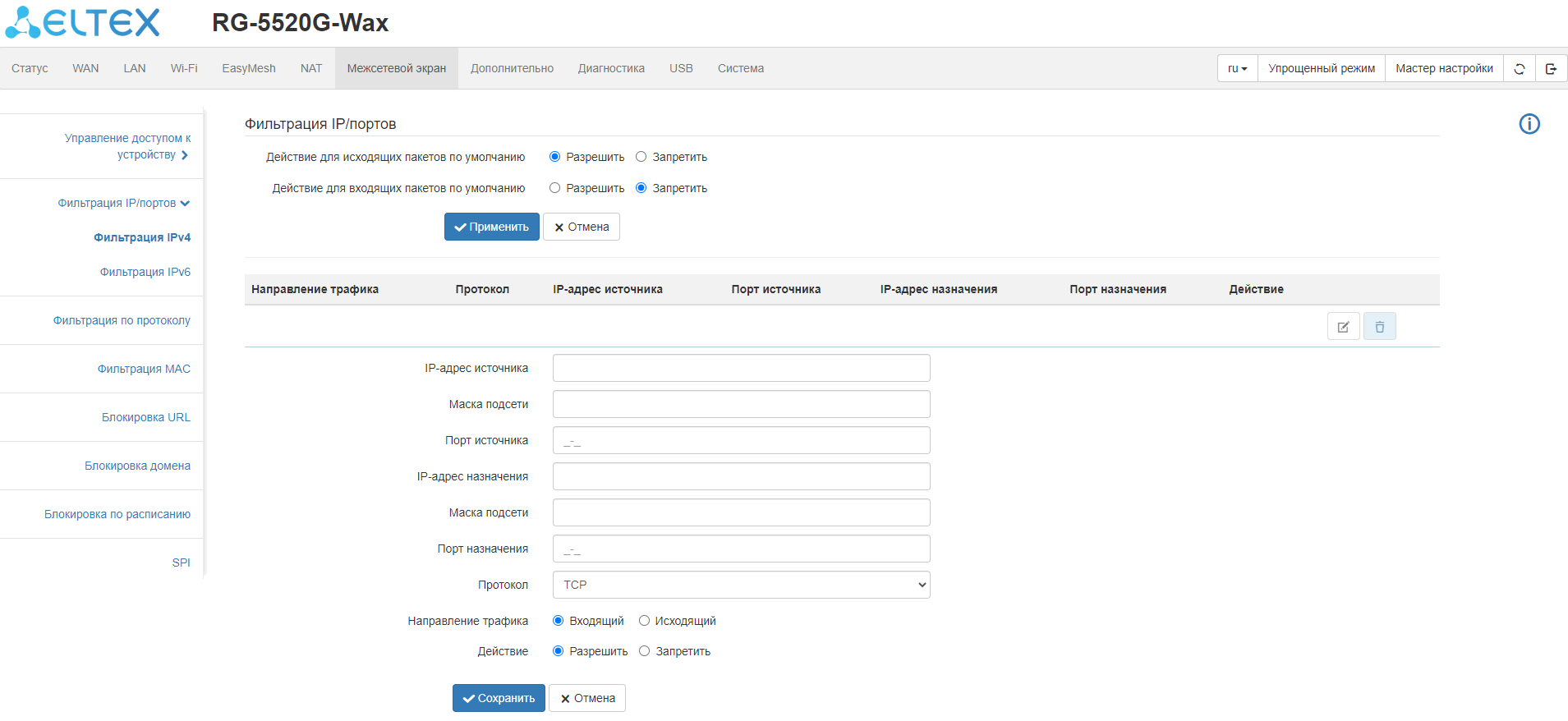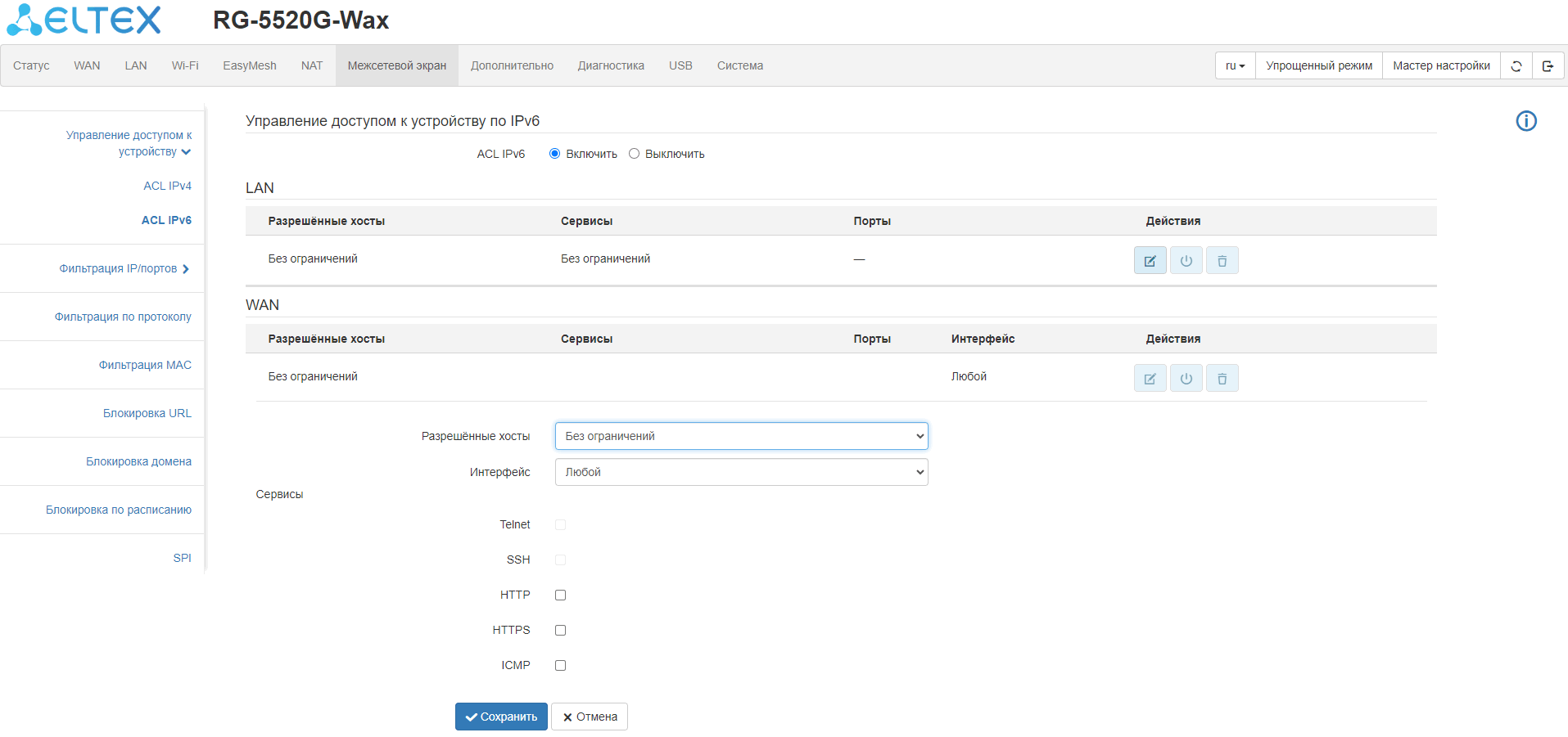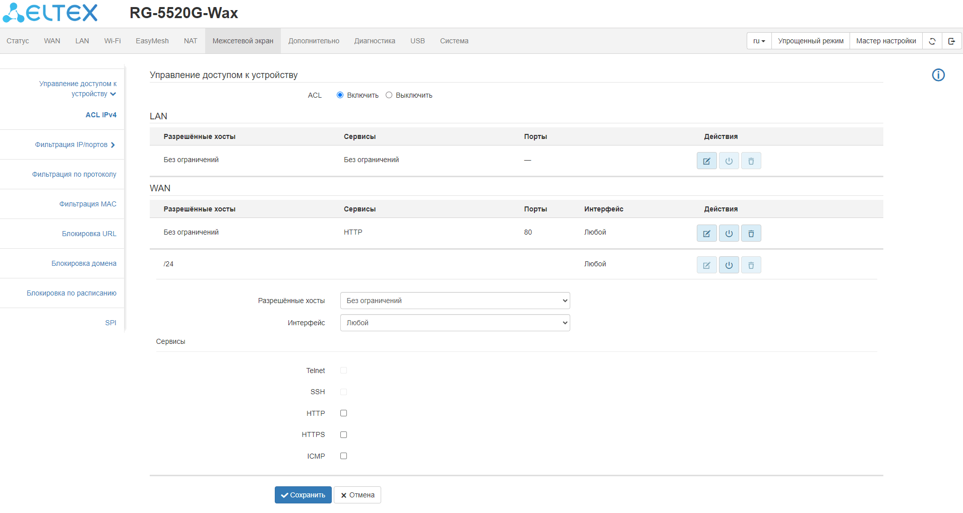 ограничение доступа к устройству через WAN и LAN;