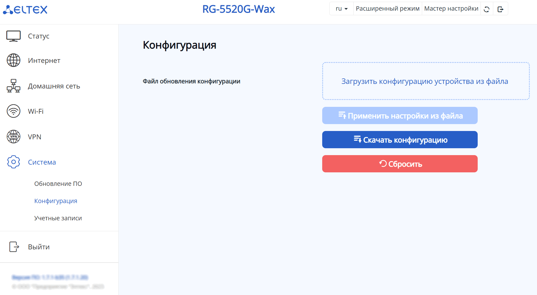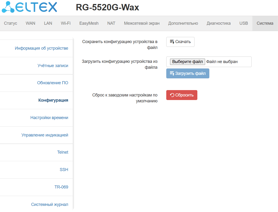Сохранить конфигурацию устройства в файл — для сохранения текущей конфигурации устройства на локальный компьютер нажмите кнопку «Скачать».