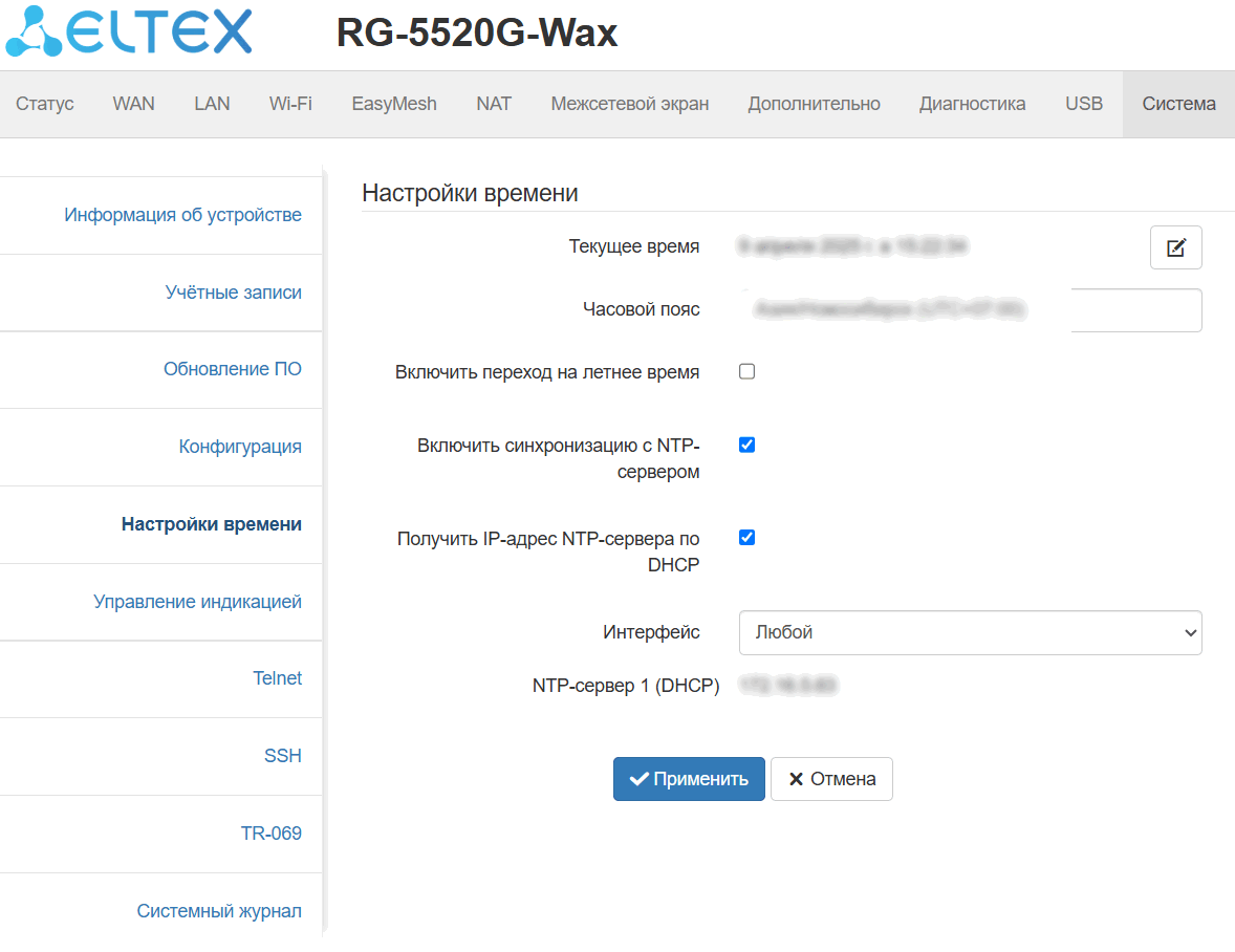 В этом подменю настраивается дата и системное время устройства при помощи синхронизации с NTP-сервером.
