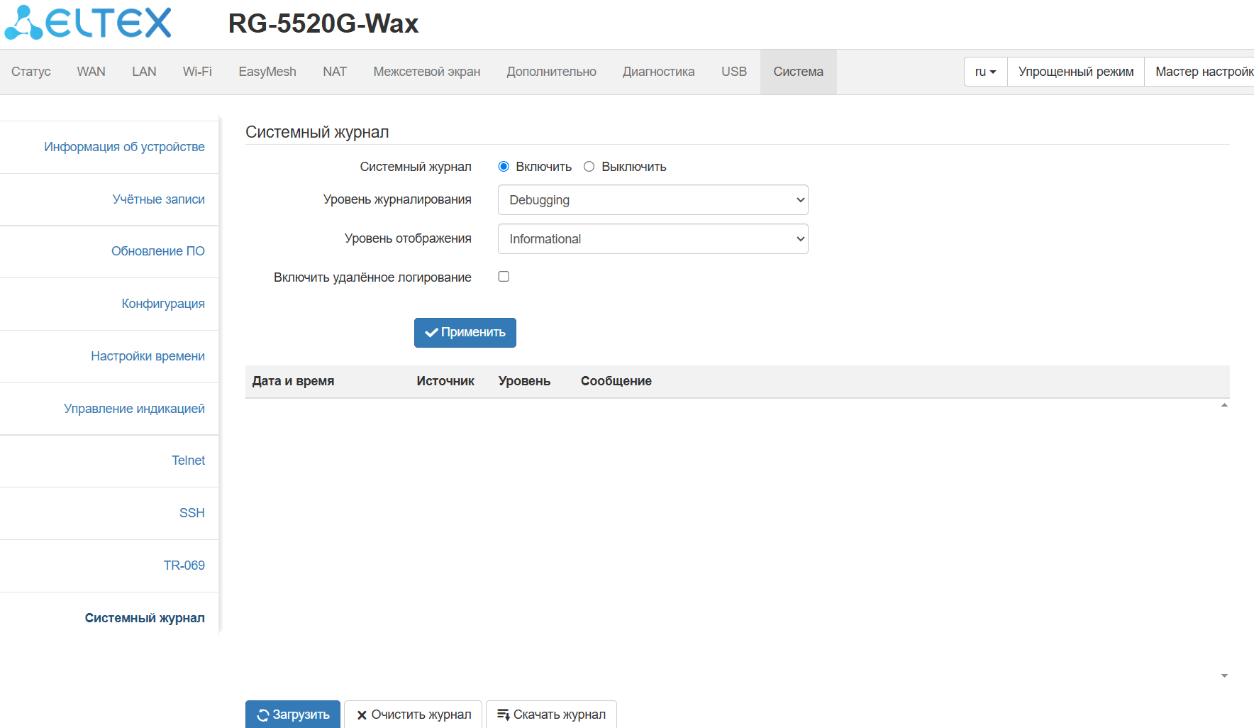 Подменю «Системный журнал» предназначено для настройки вывода разного рода отладочных сообщений системы в целях обнаружения проблем в работе устройства.
