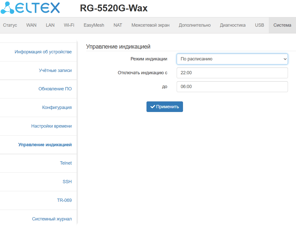 Данное подменю позволяет включать/отключать индикацию устройства либо настраивать работу индикации по определенному времени.