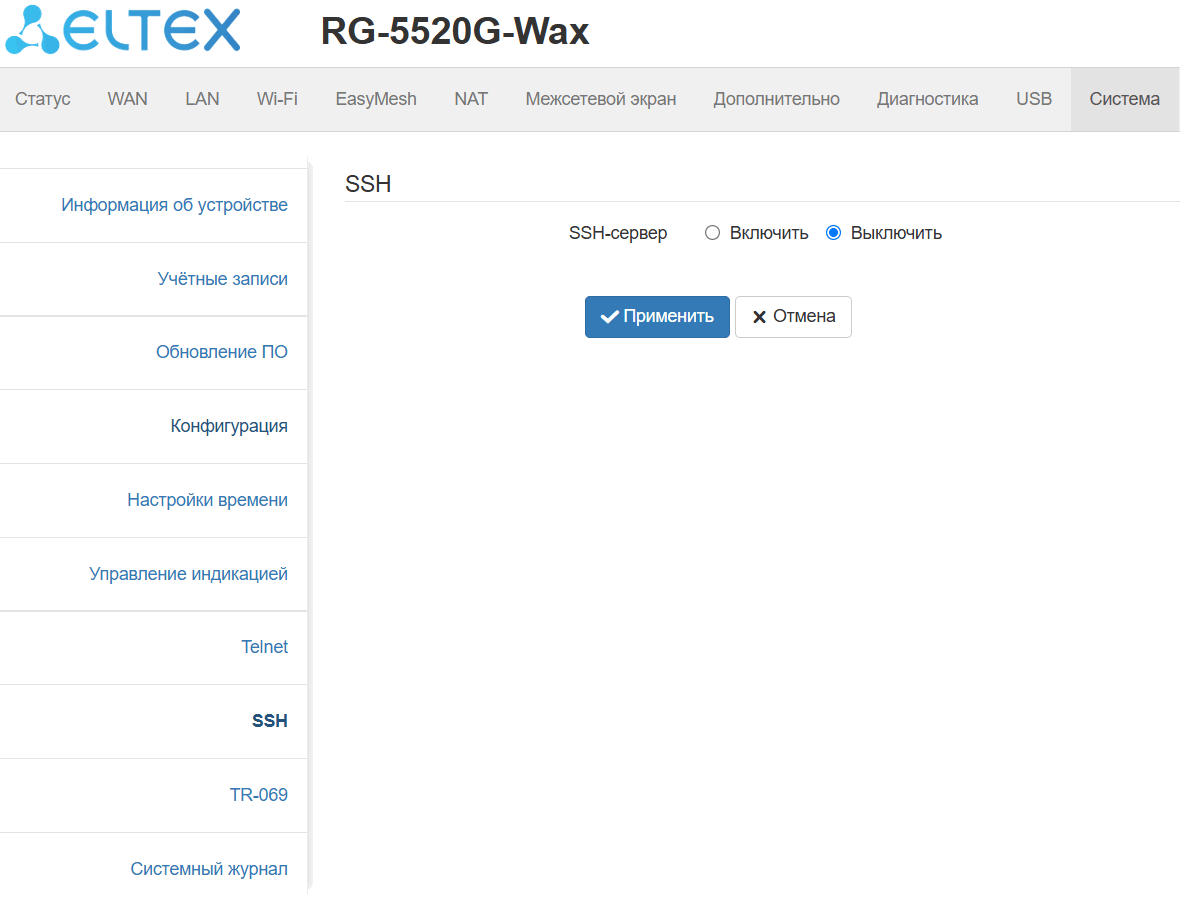 Данное подменю позволяет активировать/деактивировать функционал сервера SSH на устройстве.