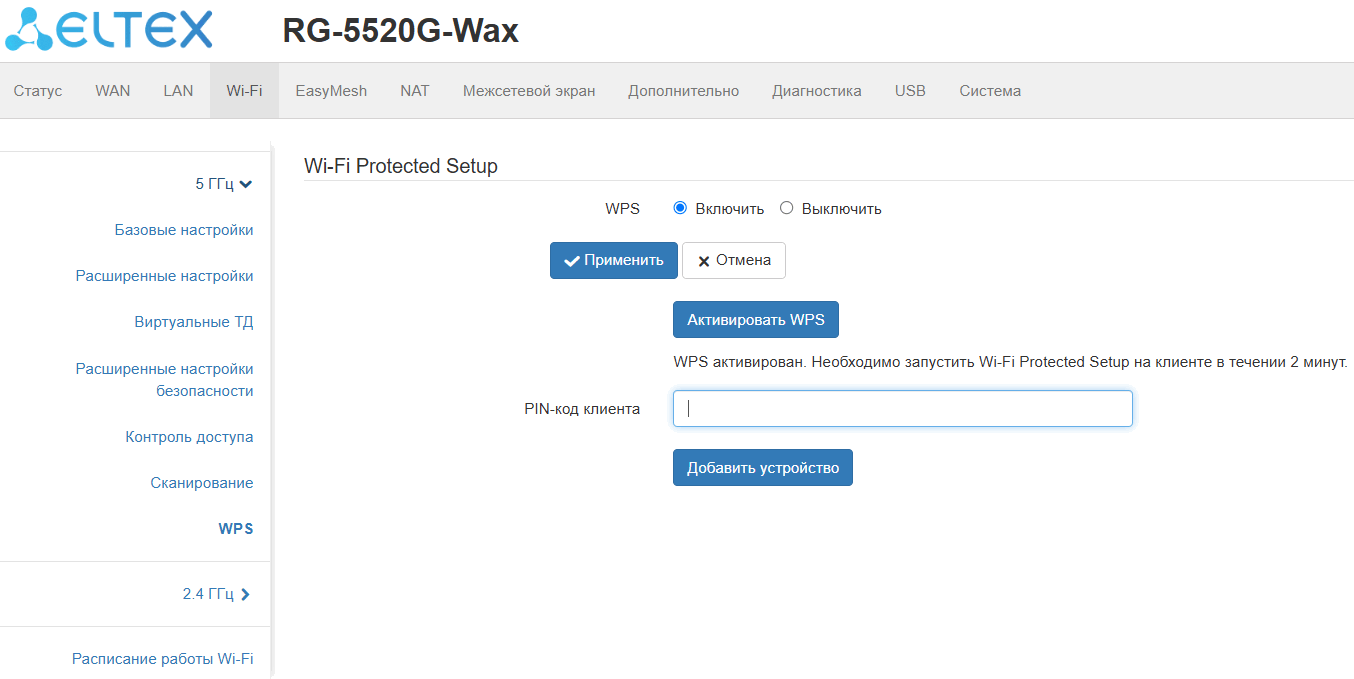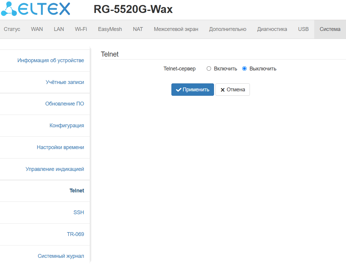 Данное подменю позволяет активировать/деактивировать функционал сервера Telnet на устройстве.