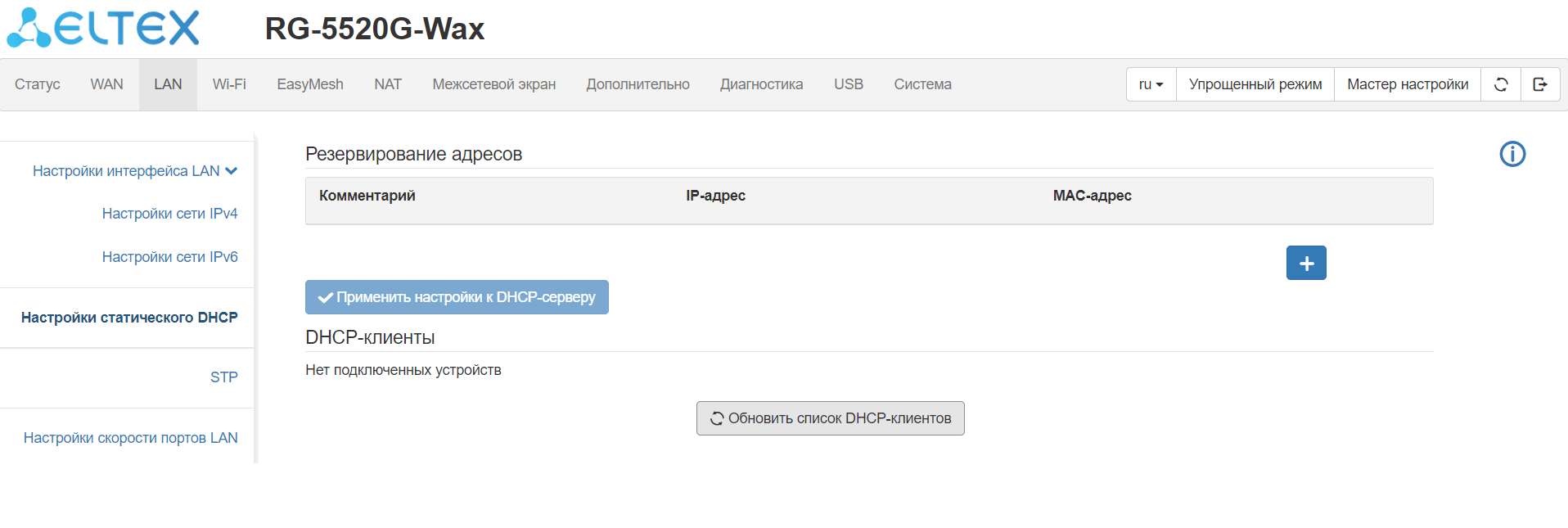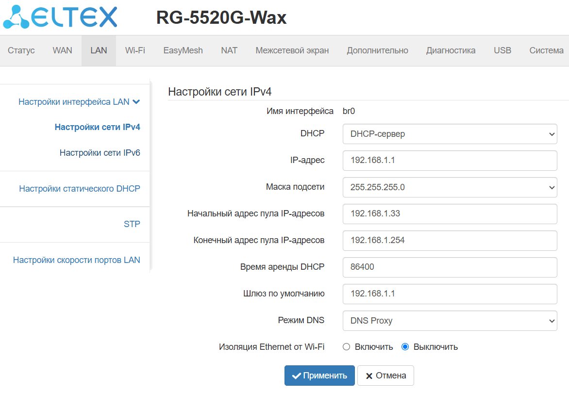 поддержка статического адреса и DHCP (DHCP-клиент на стороне WAN, DHCP-сервер на стороне LAN);