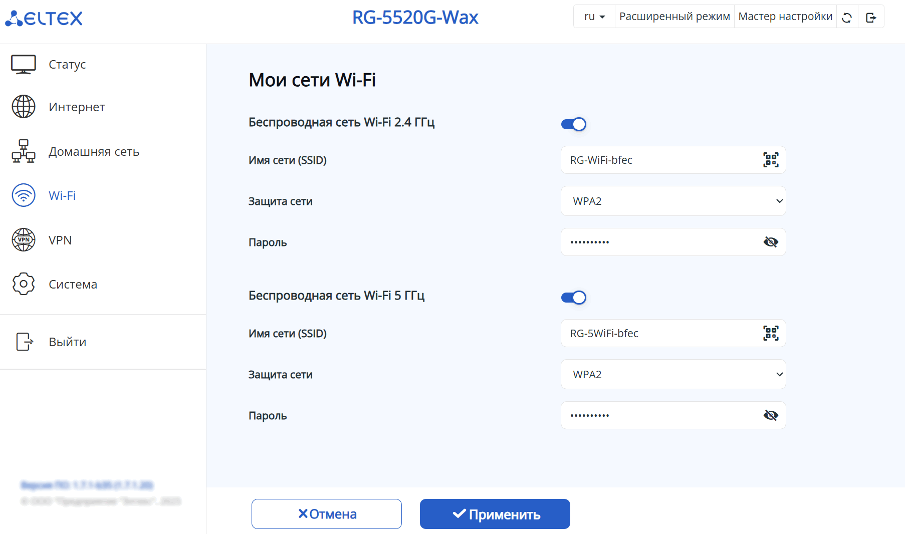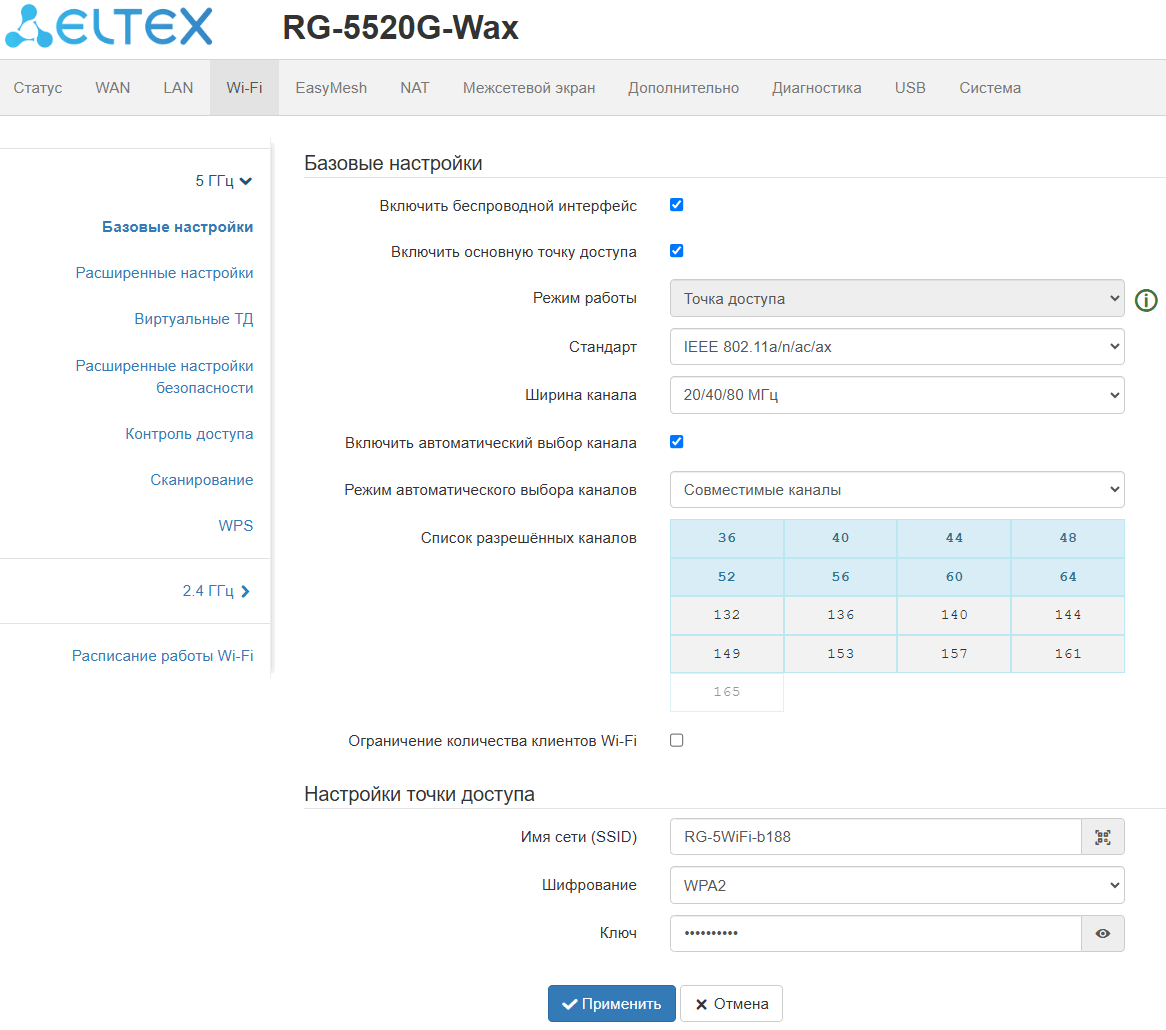 Wi-Fi роутер RG-5520G-Wax (далее «устройство») — единаяточкадоступа к современным интерактивным сервисам, использующая проводные и беспроводные сети передачи данных: Интернет и Full HD IPTV. Устройство подключается к проводной сети с помощью 10/100/1000/2500M Ethernet-интерфейса и создает беспроводной доступ для устройств, поддерживающих технологию Wi-Fi в диапазоне 2.4 ГГц (IEEE 802.11b/g/n/ax) и 5 ГГц (IEEE 802.11a/n/ac/ax).