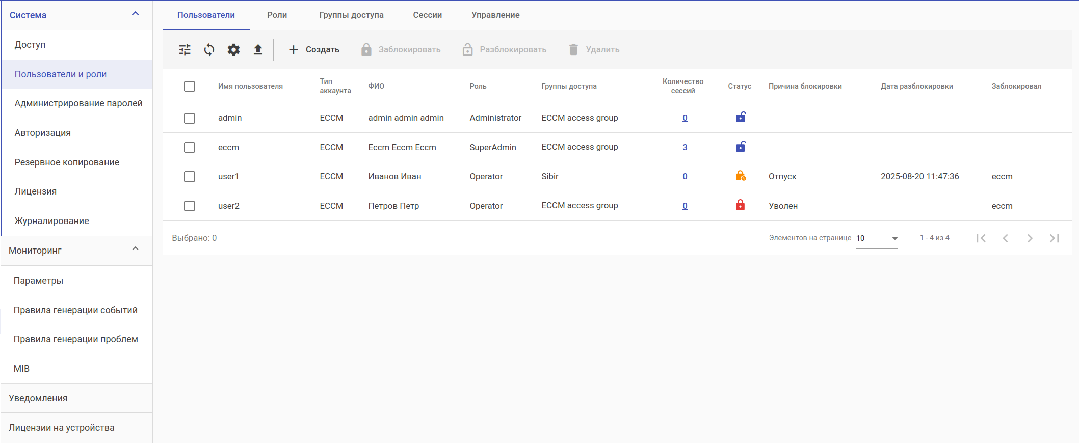 3. Operator — роль для осуществления мониторинга работы оборудования. Привилегии: просмотр данных мониторинга (состояние устройств, статистика, аварии, отчеты).