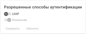 В системе могут использоваться одновременно два способа аутентификации: локальная аутентификация, когда логин и пароль учетной записи пользователя хранятся в базе данных системы управления ECCM, и аутентификация с помощью внешнего LDAP-сервера. Включение и выключение способов аутентификации реализовано через виджет "Разрешенные способы аутентификации".