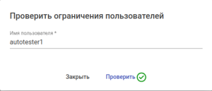 Для проверки корректности настроек ограничений пользователей нажмите на кнопку "Проверить": откроется диалоговое окно. Введите имя пользователя в соответствующее поле и нажмите кнопку "Проверить". Если условие ограничения не выполняется, то будет отображена иконка(доступ разрешен):