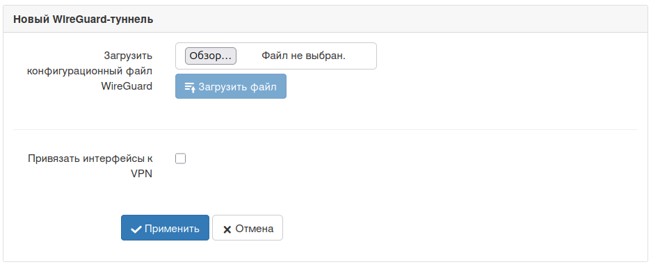 В открывшемся окне можно загрузить конфигурационный файл WireGuard. Для настройки, выберите конфигурационный файл, полученный от провайдера услуги, и нажмите кнопку "Загрузить файл".