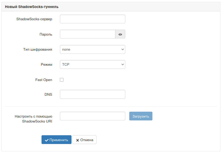 Для настройки вручную, необходимо ввести в соответствующие поля параметры, полученные от сервера: IP-адрес ShadowSocks-сервера, пароль, IP-адрес DNS-сервера; и выбрать тип шифрования. Для ShadowSocks по адресу интерфейса br0 с портом 1080 будет запущен proxy-сервер SOCKSv5.