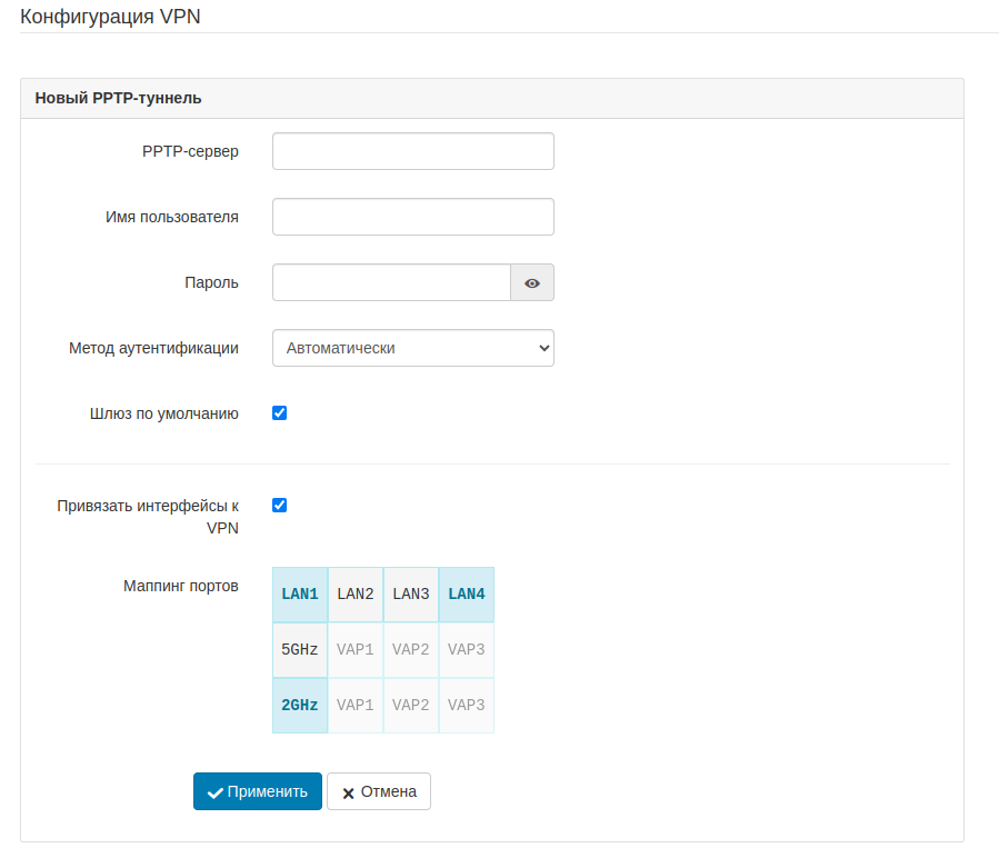 Настройка может быть осуществлена через web-интерфейс на странице WAN - VPN