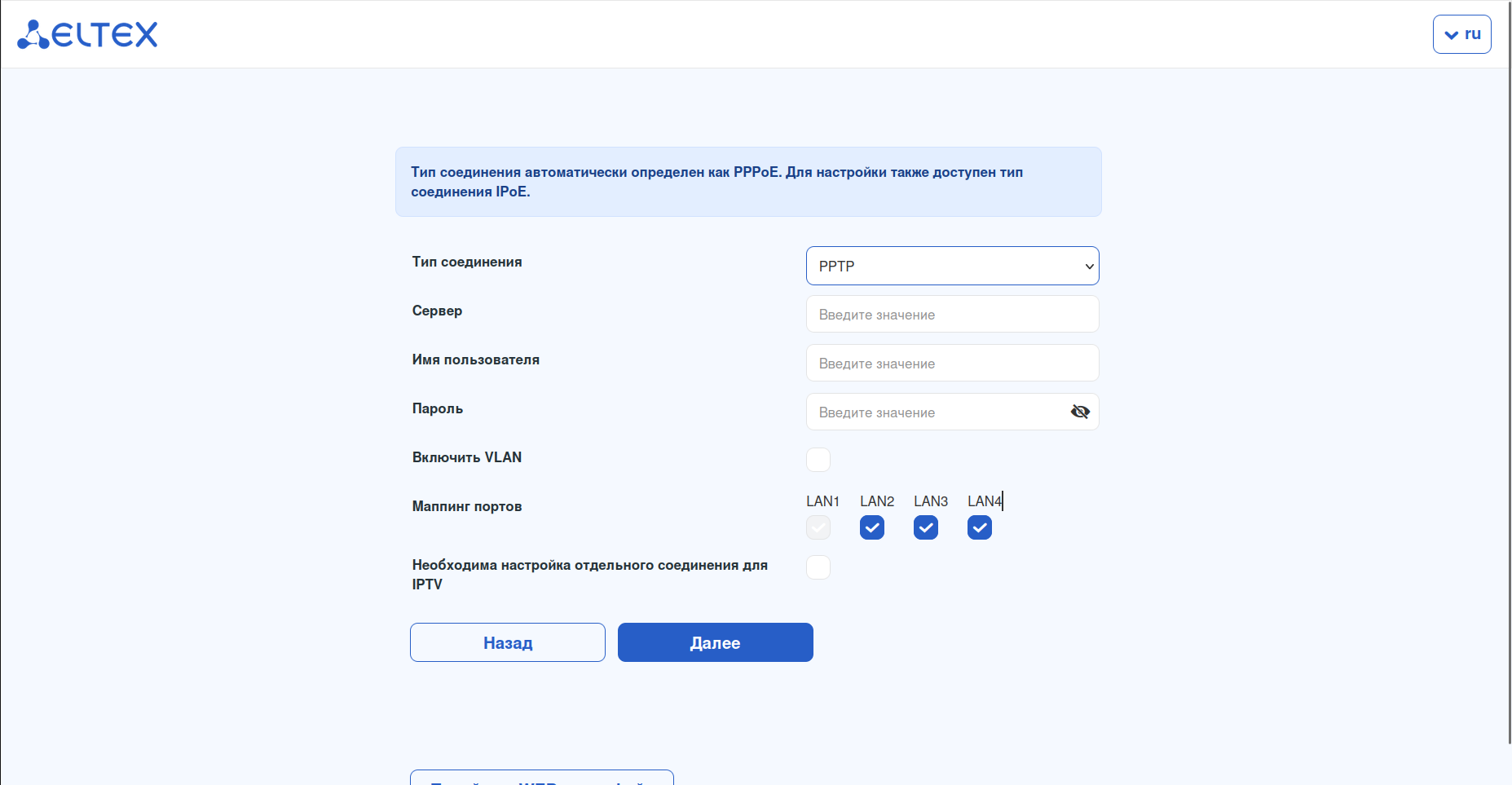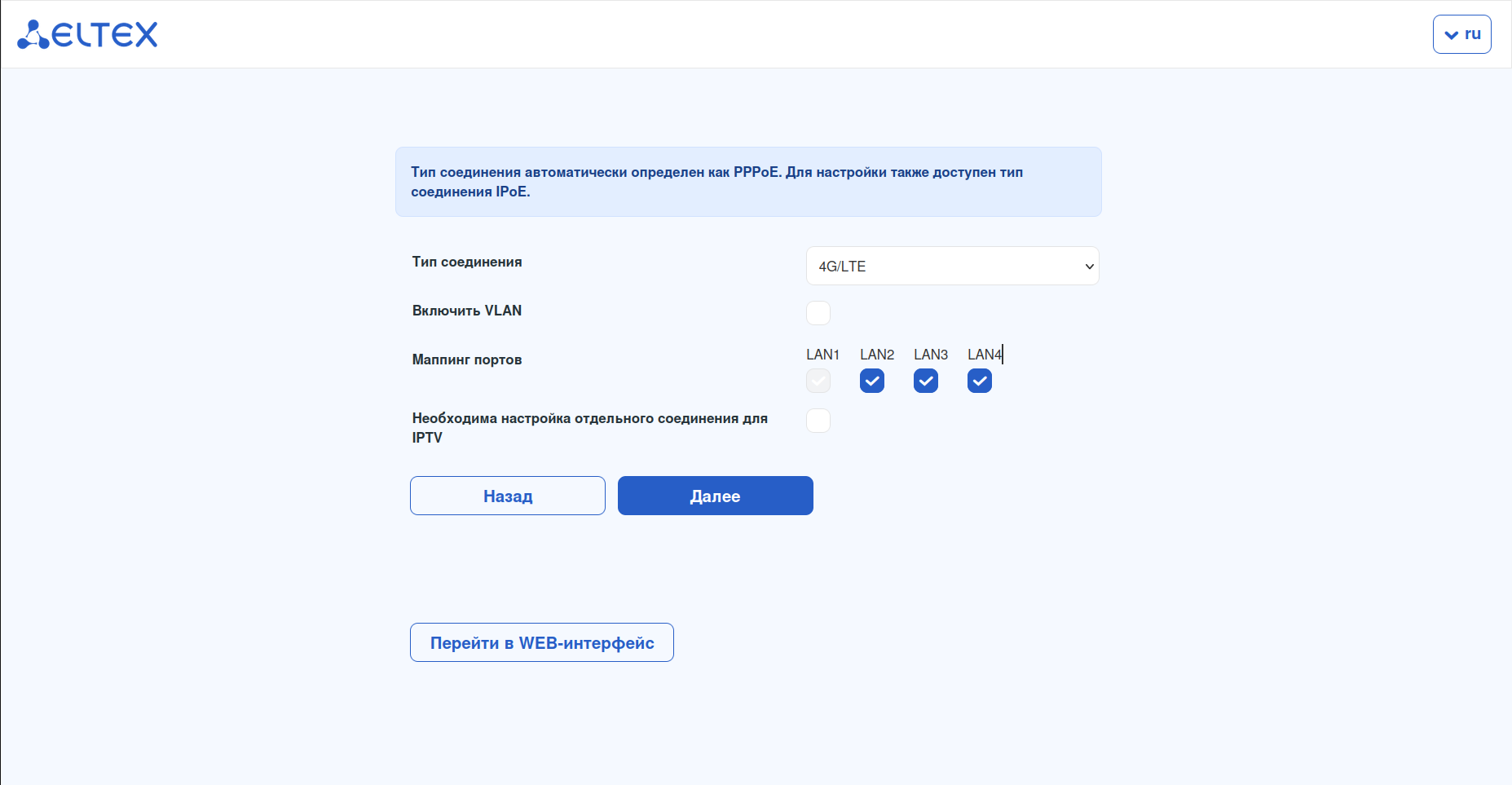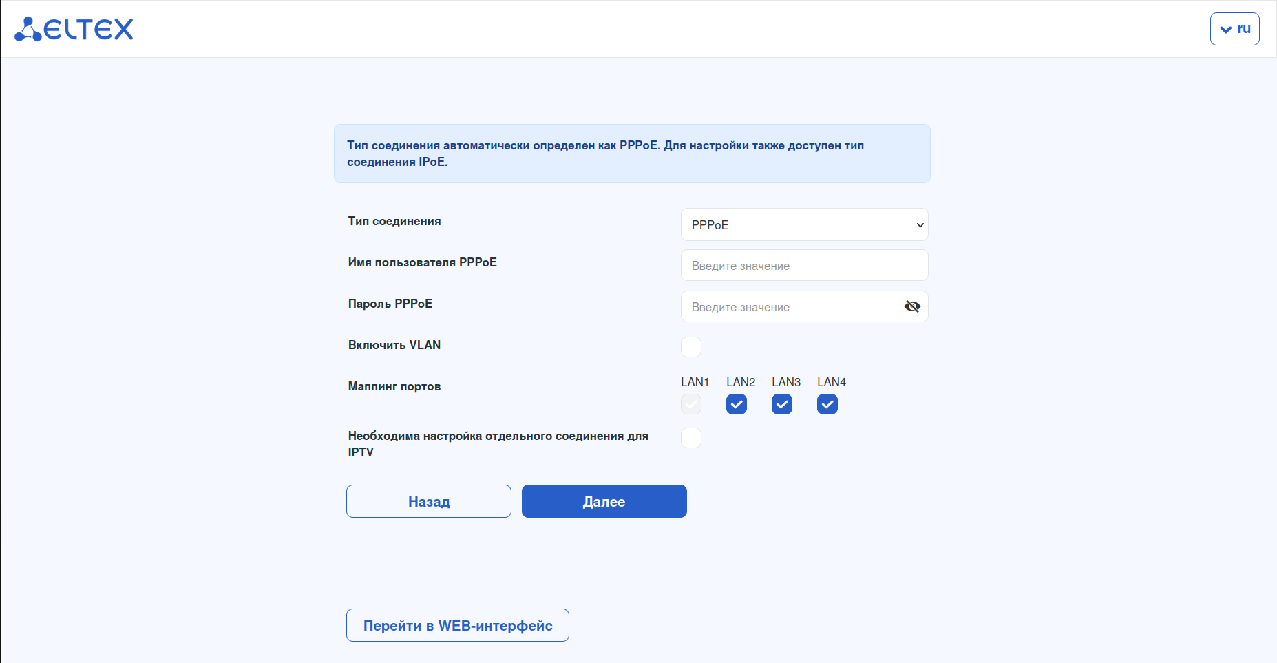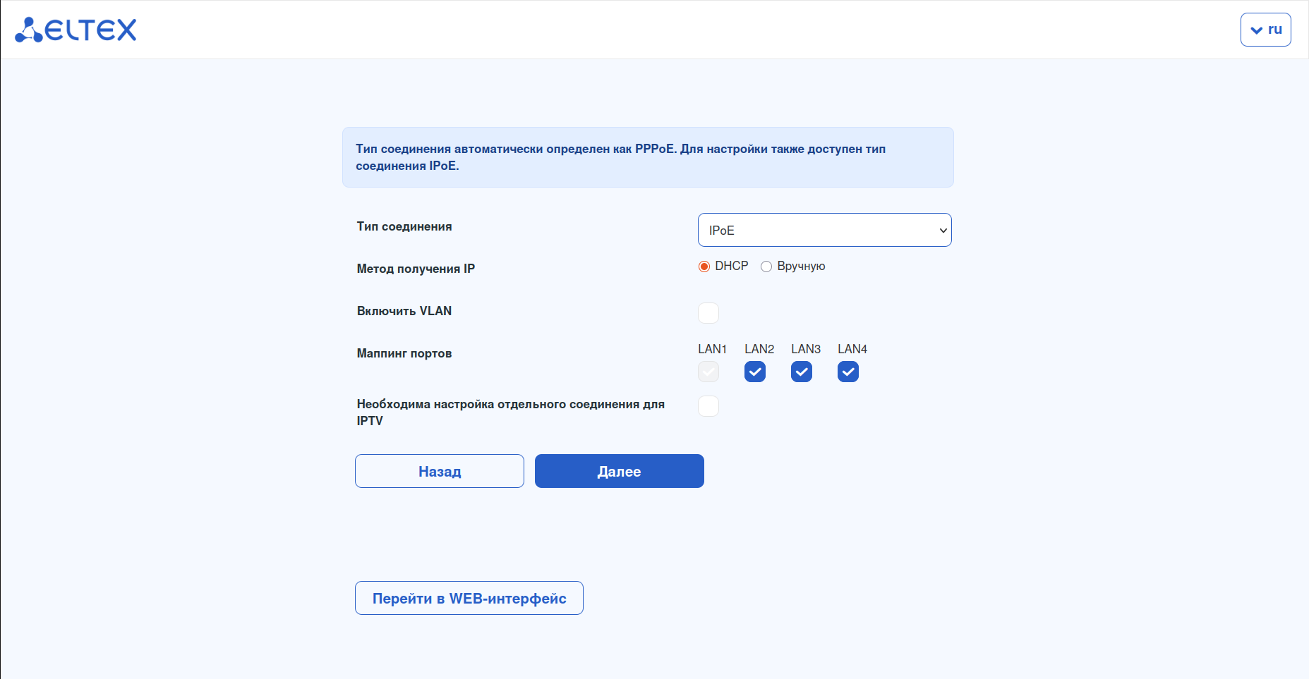 При первом включении маршрутизатора Eltex и подключении сетевого кабеля в WAN-порт требуется указать тип подключения, используемый провайдером.