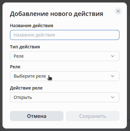 Далее выберите тип действия — Реле, нужное реле из списка и действие реле — Проход.