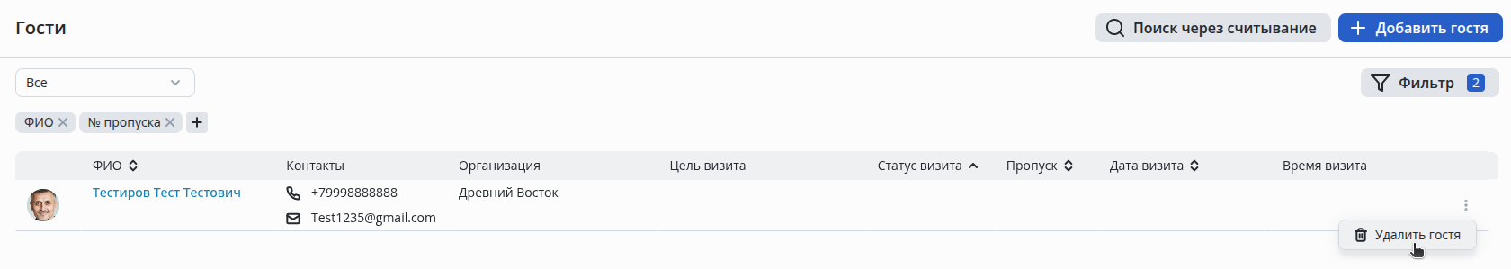 Для редактирования гостя нажмите на имя гостя в таблице.