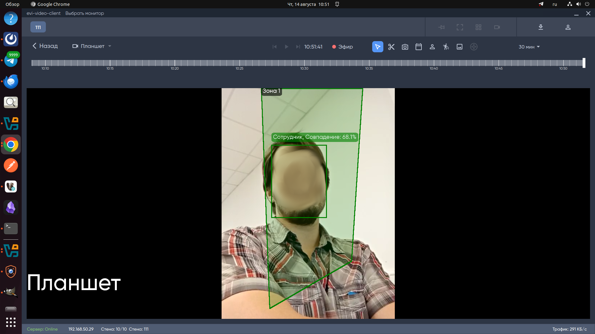 Отображение работы аналитики в эфире камеры при включенной аналитике по лицу сотрудника.