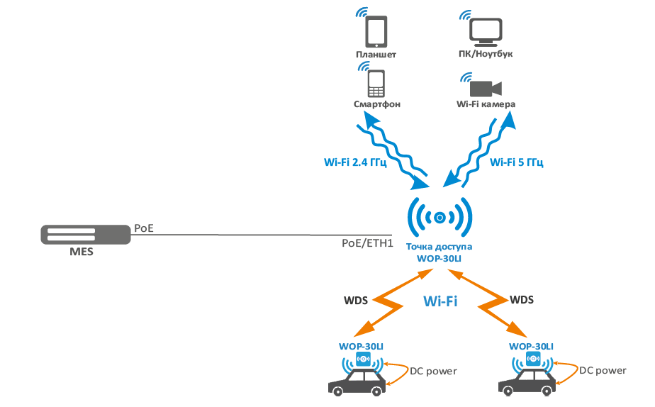 Рисунок 3 — Использование точки доступа WOP-30LI с DC-питанием и WDS