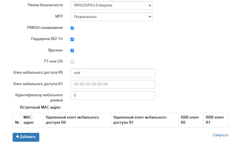• централизованная авторизация через RADIUS-сервер (802.1X WPA/WPA2/WPA3 Enterprise);