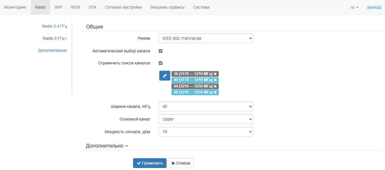 WOP-30LI(config):/radar# scan-limit-channels-5g "36 40 44 48" (где 36, 40, 44, 48 — каналы для сканирования в диапазоне 5 ГГц. Пустое значение — сканируются все доступные каналы)