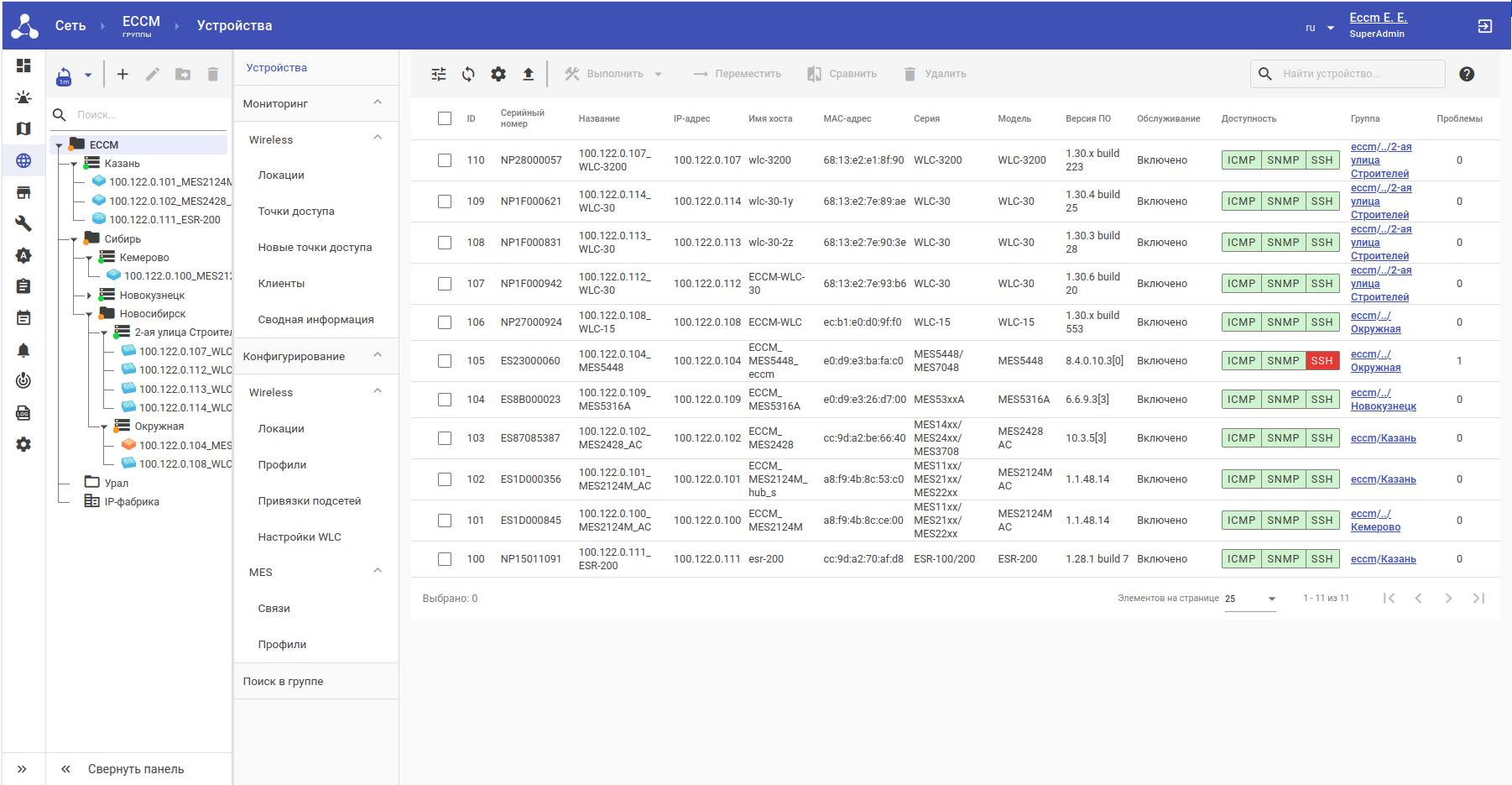Раздел Wireless отображается в меню группы при наличии устройств WLC в системной лицензии.