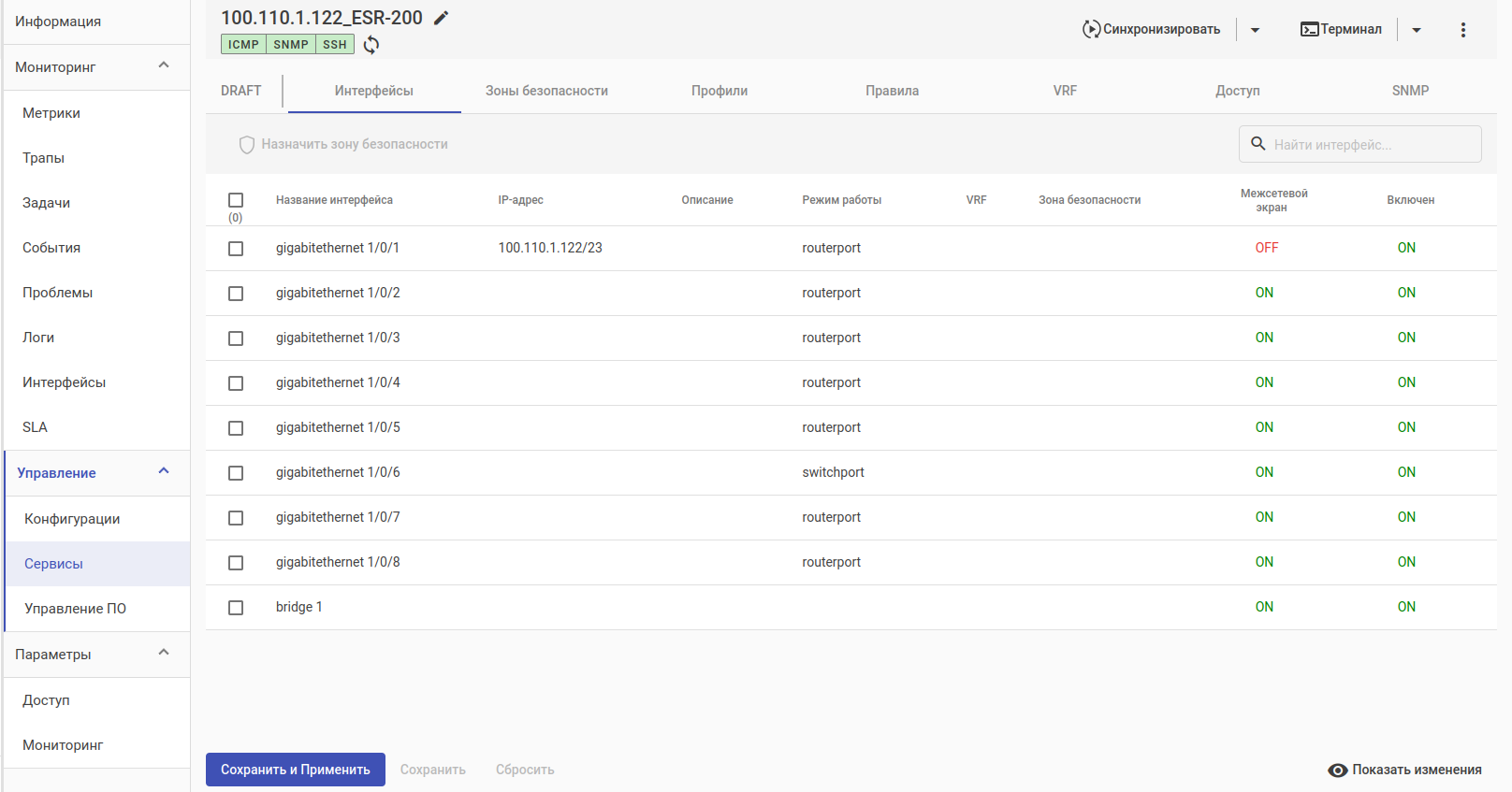 Для настройки интерфейсов устройства перейдите во вкладку "Устройство" → "Управление" → "Сервисы" → "Интерфейсы":