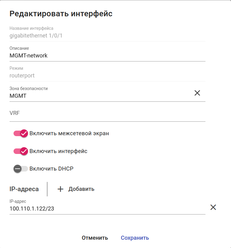 Чтобы настроенные ранее правила применялись к трафику конкретного интерфейса, необходимо включить интерфейс в зону безопасности. Включение интерфейса в экземпляр VRF позволит изолировать пользовательский трафик от остального. Также на интерфейсе необходимо настроить IP-адрес, если это не было сделано ранее.