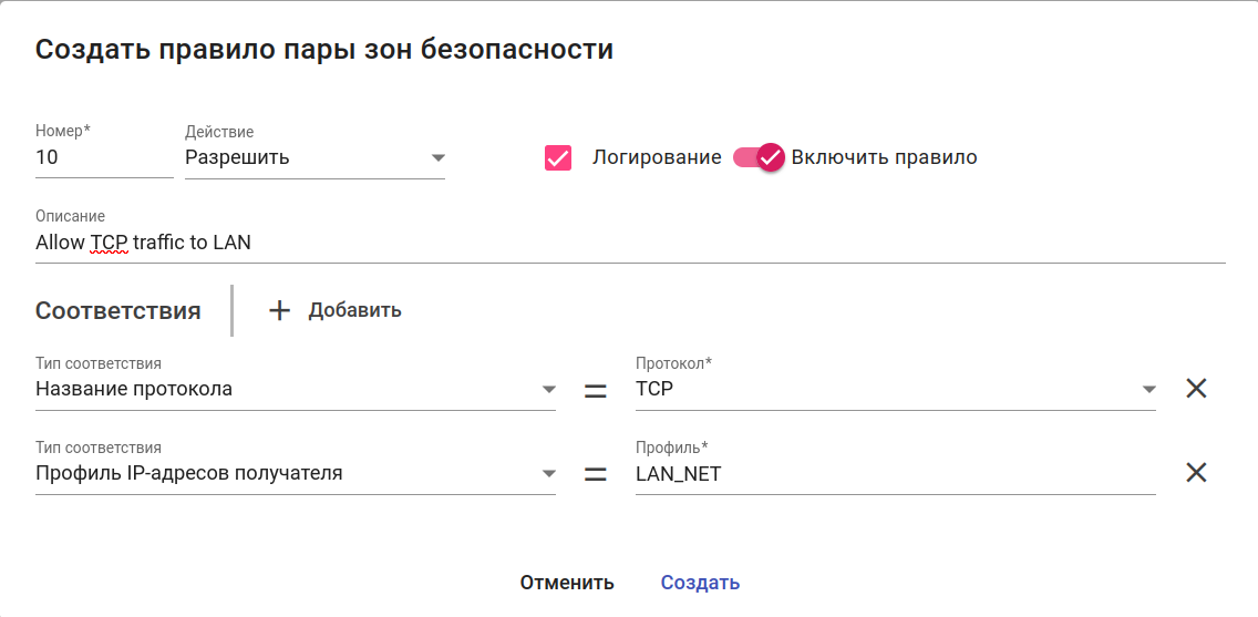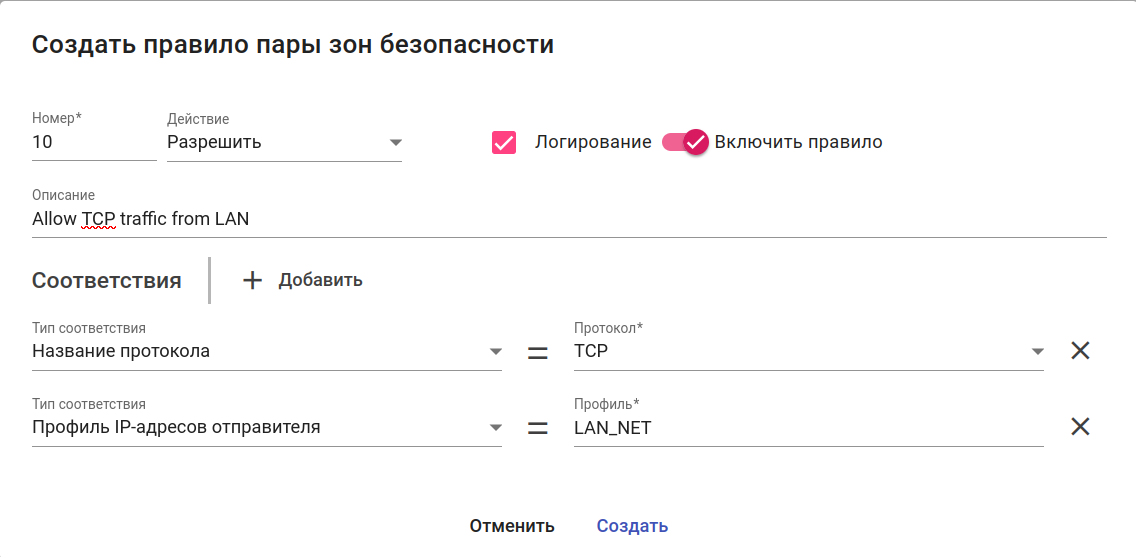 Для того чтобы трафик смог пройти из одной зоны в другую, необходимо настроить правила.