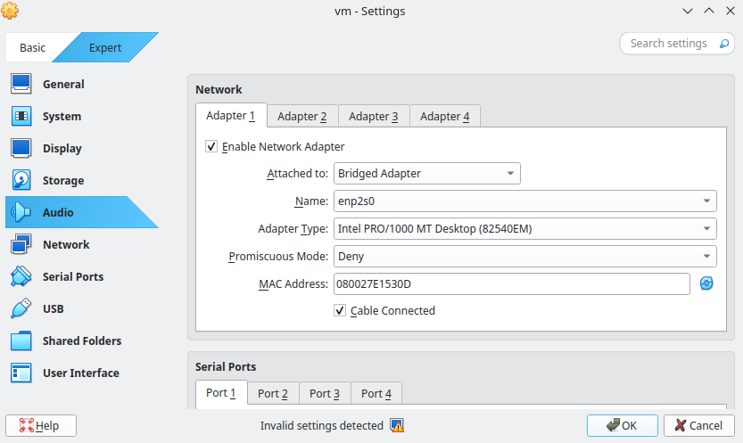 4) После полной загрузки образа виртуальной машины необходимо зайти в настройки сети (Network), выбрать режим Сетевой мост (Bridged Adapter) и выбрать необходимый сетевой интерфейс