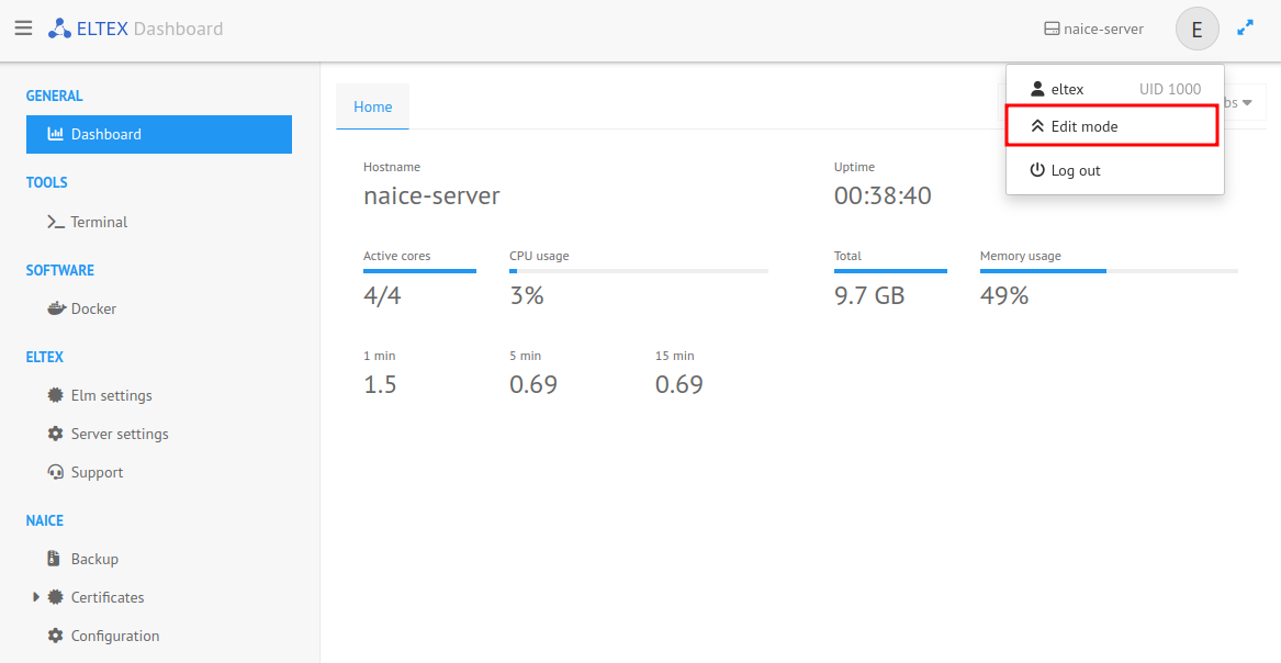 По умолчанию веб интерфейс работает в режиме Read-Only. Для перехода в режим редактирования необходимо нажать на кнопку E в правом верхнем углу экрана и выбрать Edit Mode