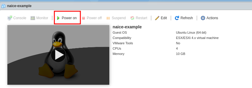 7) Перейти в виртуальную машину и нажать кнопку Power on