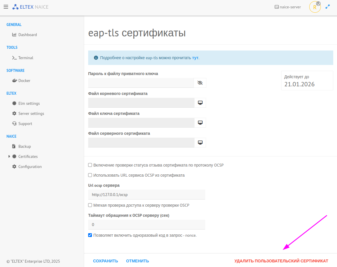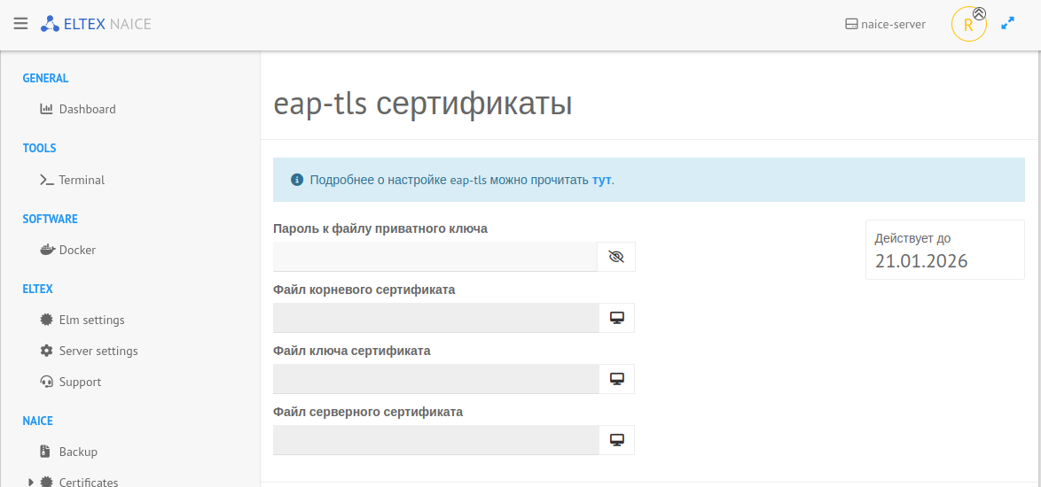 После чего перейти на вкладку NAICE → Certificates → eap-tls и загрузить следующие файлы, а также ввести пароль к файлу приватного ключа (при необходимости) и нажать кнопку Сохранить: